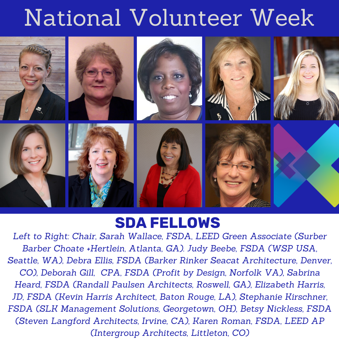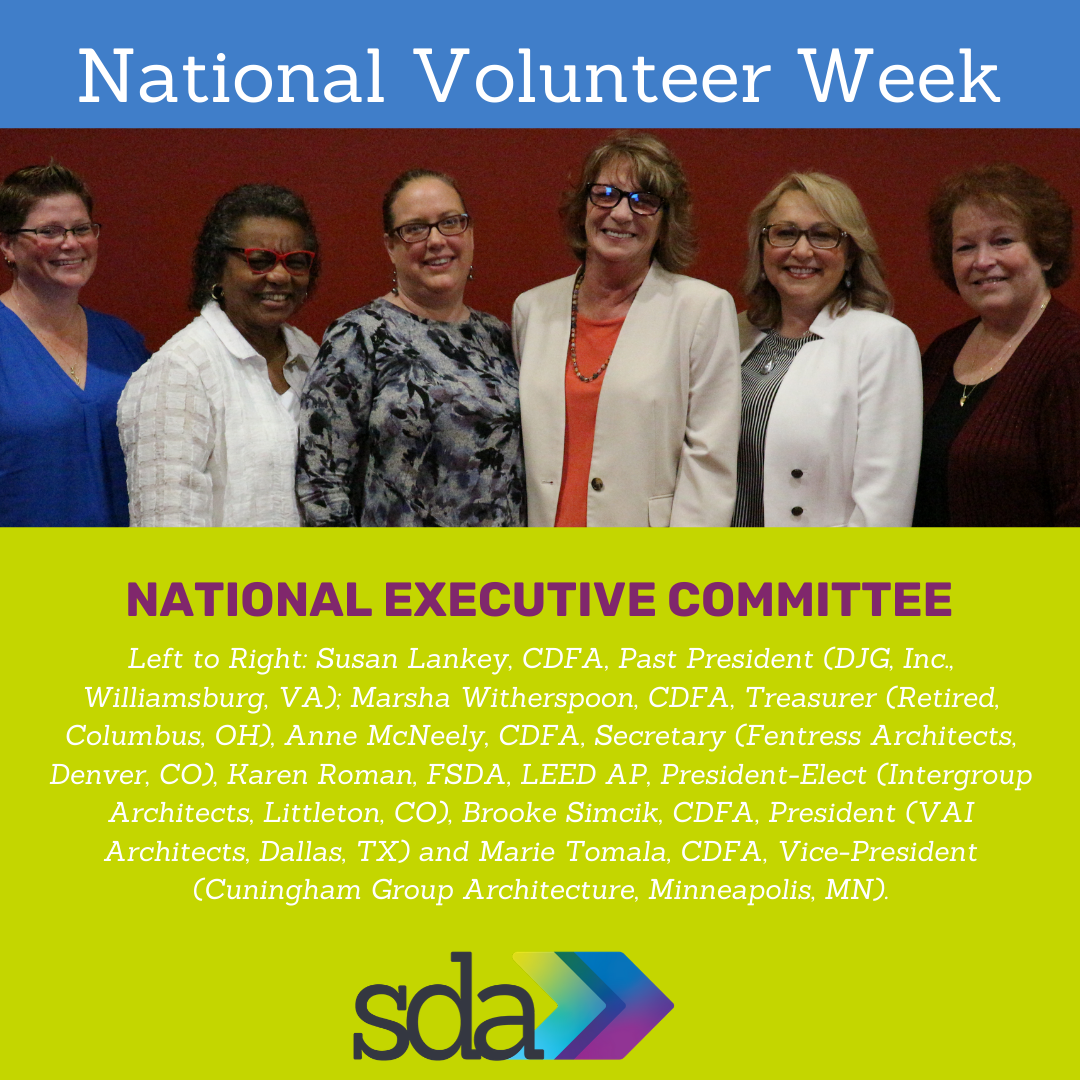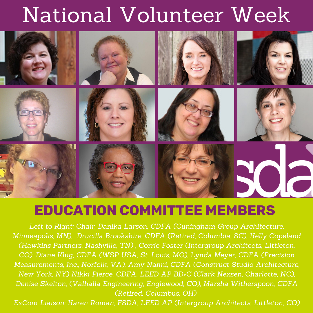 It's National Volunteer Week. We have been featuring our volunteers on our social media pages this week and wanted to give them a shout out here too! Thanks you all for what you do to help SDA share the great news about education and best practices in A/E/C operations each and every day. If you would like to serve on a national committee, contact SDA Headquarters and we will get you started!